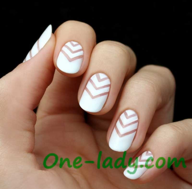 Прозрачным на нем может быть любой узор: геометрический (треугольник, ромб, квадрат, полоски и т.п.) или романтический (сердечко, бабочка и т.д.) - на что хватит фантазии и мастерства. Или наоборот - узор делается окрашенным, остальная часть ногтя остается прозрачной. Главное, чтобы на ногте оставалось пространство без окраса, а граница между ним и узором имела четкие формы.