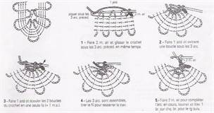 В технике брюггское кружево соединяют только ажурные части (полукольца из воздушных петель), вывязывая крючком столбики в середину полукруга, а не петли. Второе соединение выполняется столбиком с одним накидом, дальше с двумя, тремя и четырьмя. Но провязываем их неполностью, оставляя последнюю петлю на крючке, и затем начинаем вязать следующий столбик с бОльшим количеством накидов. Следующие соединения выполняем столбиком с 3-мя накидами, дальше с двумя, одним. Т.е. в обратную сторону, на уменьшение.