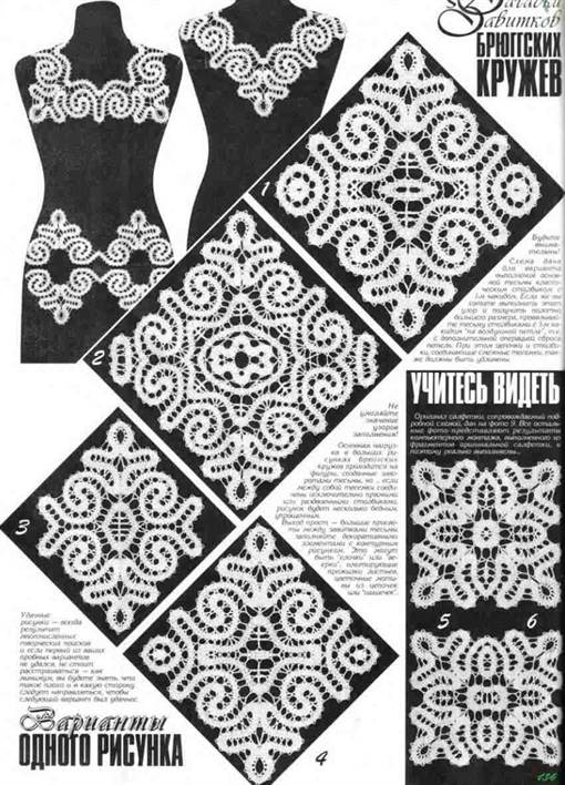 Тесьма, замыкаясь в круг, квадрат, образует элементы, которые формируют различные узоры. Некоторые схемы брюггского кружева, связанного крючком, мы вам предлагаем ниже: