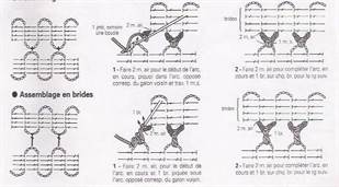 В процессе вывязывания мотивов тесьма-лента соединяется дужками, образованными воздушными петлями. Соединение делается возд. петлей, ст. с/н и ст. б/н, в зависимости от рисунка. Параллельное расположение тесьмы достигается соединением двух лент одинаковыми столбиками. Расхождение лент получается при соединении столбиков разной высоты, так мы добиваемся изгиба ленты: