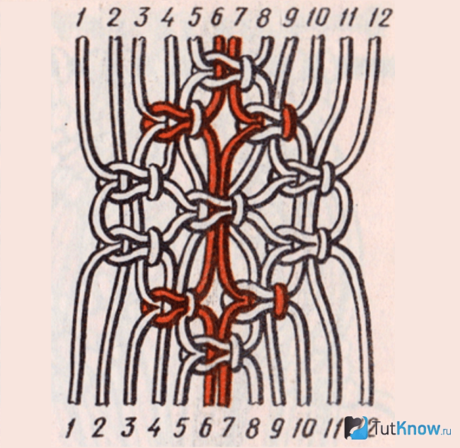 - Третий ряд: два «квадратных» узла нужно сплести из 1, 2, 3, 4 нитей и из 9, 10, 11, 12.