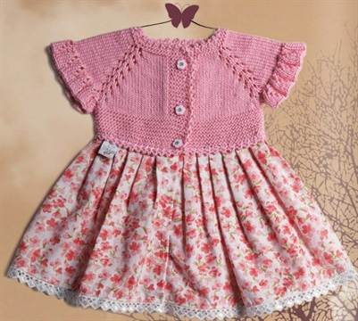 Описание к модели рекомендует это платье для ребенка от 3 до 6 месяцев. Однако думается, что эта универсальная модель вполне применима и для барышень постарше. Если вы владеете техникой вязания на спицах, изменить размер под себя, точнее, под вашу принцессу, труда не составит.