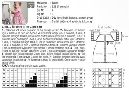 Спинка платья : вязать, как перед. Для выреза горловины закрыть средние 19 п. на 3 см выше, чем на переде, затем с обеих сторон 3 п., 2 п., и на высоте переда закрыть п. Юбочку вязать, как на передней детали.