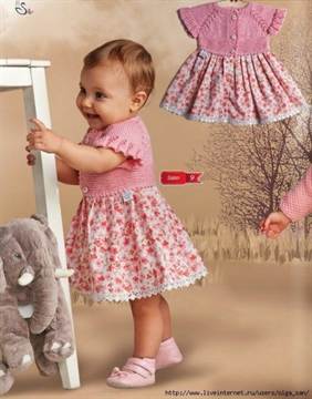 Необычность этой модели в ее сочетании с тканью. Лиф вывязывается на спицах, а юбочка шьется из подходящего по цвету и фактуре материала.